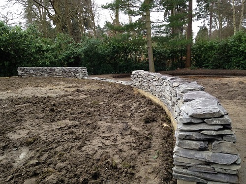 The garden design opposite in Esher, Surrey required building terraces at different heights and the movement of hundreds of tonnes of materials.